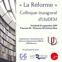 UbiDEM, l’association des élèves du département DEM de l’ENS Rennes organise un colloque de recherchesur le thème de « La Réforme ». Cela recouvre un grand nombre de problématiques, du concept de réforme aux réformes futures en passant par une étude des réformes passées. L’objectif est d’avoir une approche générale de la réforme ; de comprendre ses processus, sa légitimité, ses succès et ses échecs. Une douzaine d’universitaires se succèderont au fil de cette journée pour explorer en profondeur ce thème transversal.