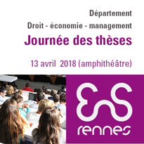 - 14h00 : Présentations de projets de thèse d’élèves de l’ENS Rennes en droit, en économie et en gestion. Après chaque présentation par les élèves, les professeurs invités commenteront les projets de thèses. Il s’agit d’avoir une approche réflexive sur les critères d’évaluation des thèses.